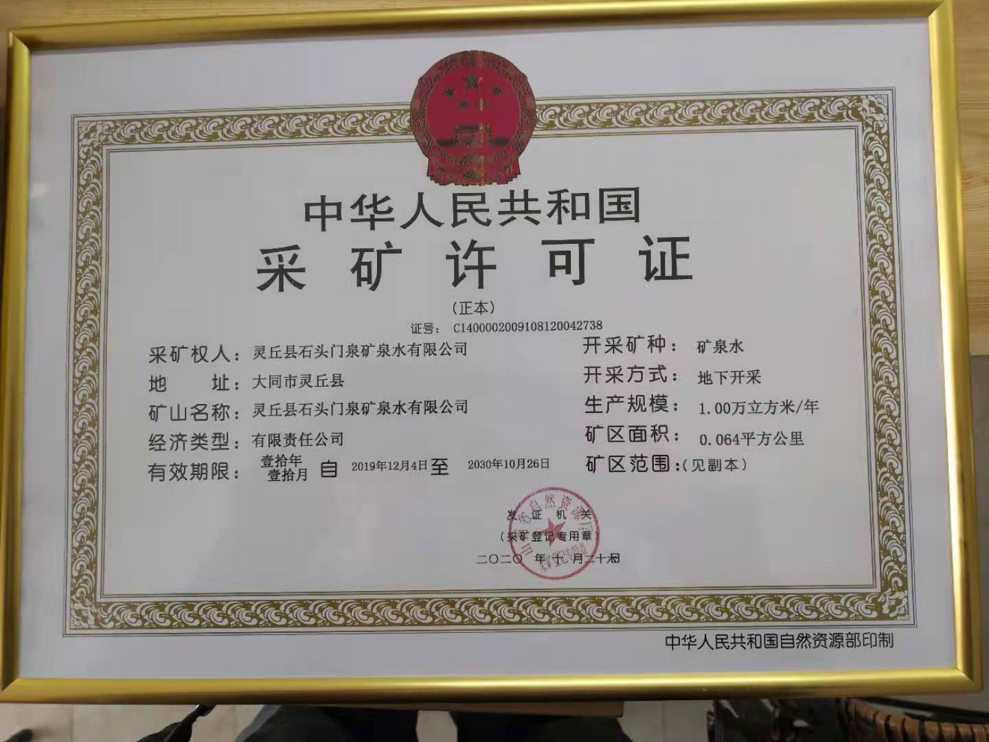 石头门泉为中国优质矿泉水源地,位于灵丘县红石塄乡沙湖门村。2020年10月山西省自然资源厅为灵丘县石头门泉矿泉水有限公司颁发长期采矿证,自此灵丘矿泉水完成资源整合换证工作。该公司取得石头门泉域饮用天然矿泉水采矿权,为大同市唯一具有矿泉水采矿权的企业。